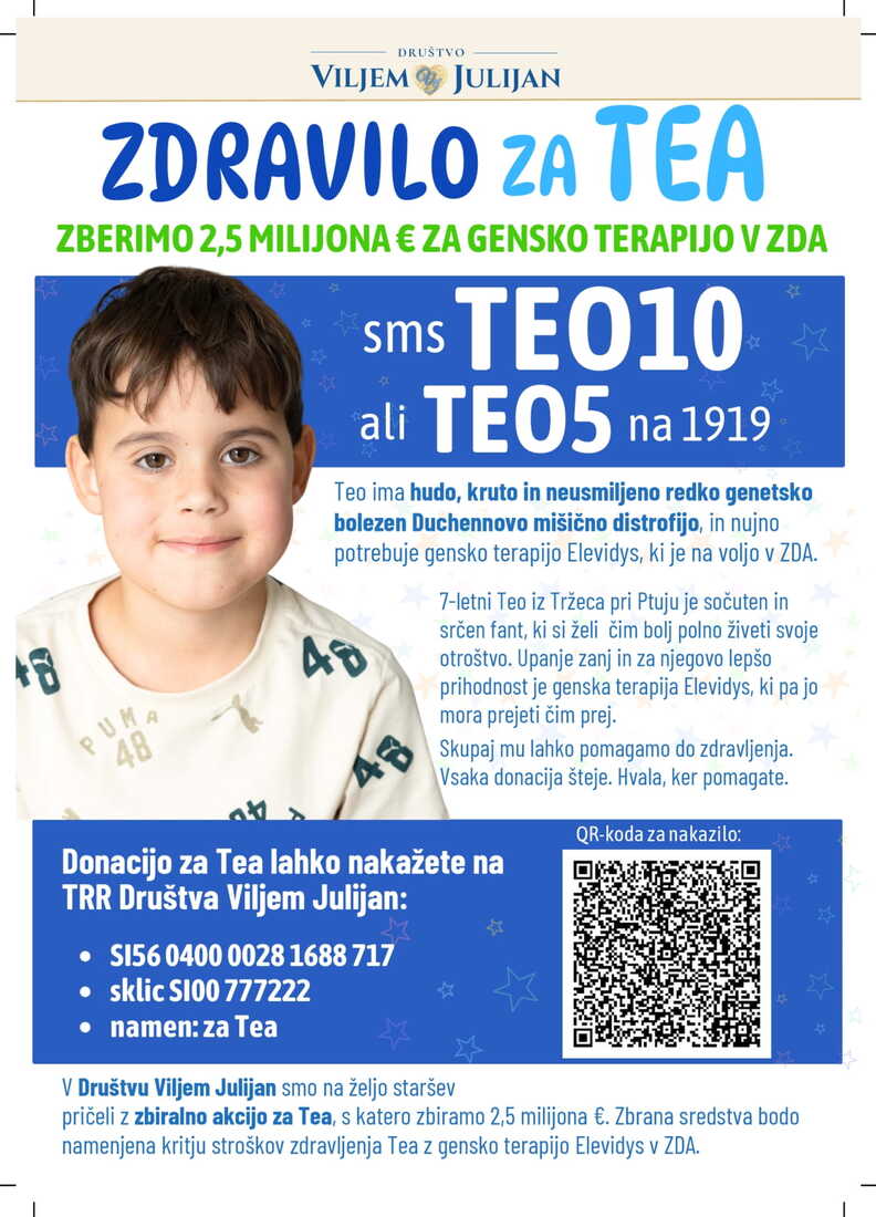 V ZDA je odobrena genska terapija Elevidys, ki bolnikom s to boleznijo prinaša novo upanje. Žal pa je zdravljenje izjemno drago in stane 2,5 milijona € (2,9 milijona $), strošek pa ni krit s strani zdravstvenega zavarovanja. Edina možnost, da bi Teo lahko prejel to zdravljenje je, da njegovi starši s pomočjo donacij zberejo potrebna sredstva. V sodelovanju z Društvom Viljem Julijan smo zato začeli z zbiralno akcijo in se s srčno prošnjo obračamo na ljudi, da Teu pomagamo do zdravila. Pri tem pa je čas ključnega pomena, saj mora zdravljenje prejeti čim prej.